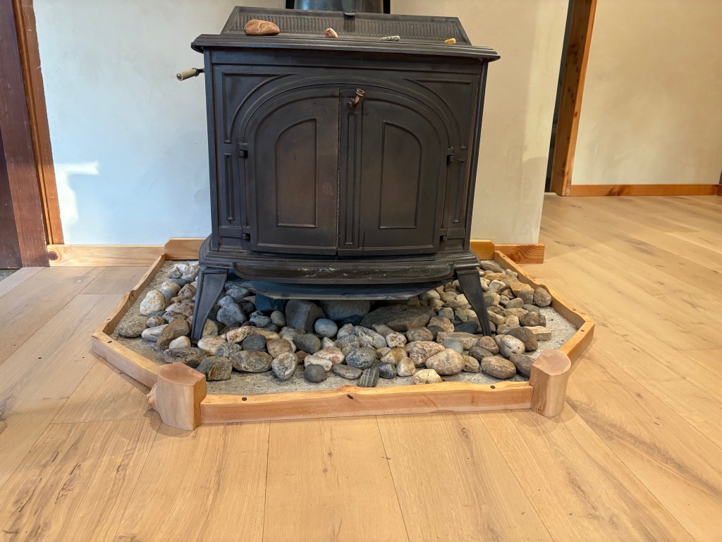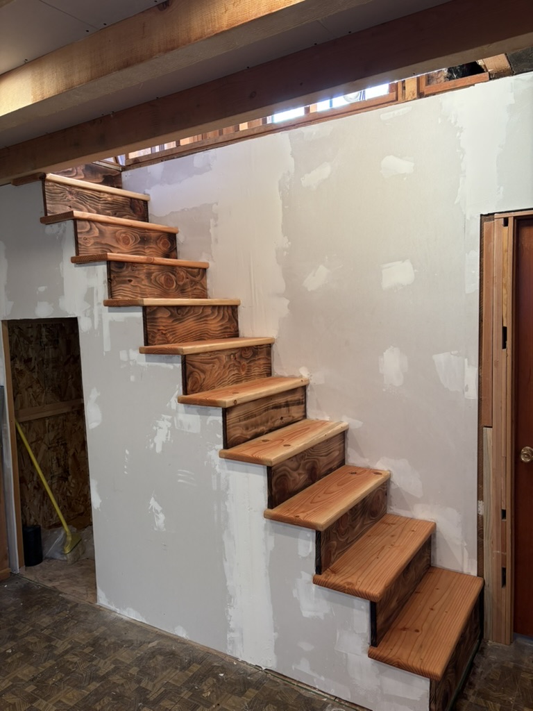 Fir tread stairs to match interior beams (light use stairs) and burnt cedar risers