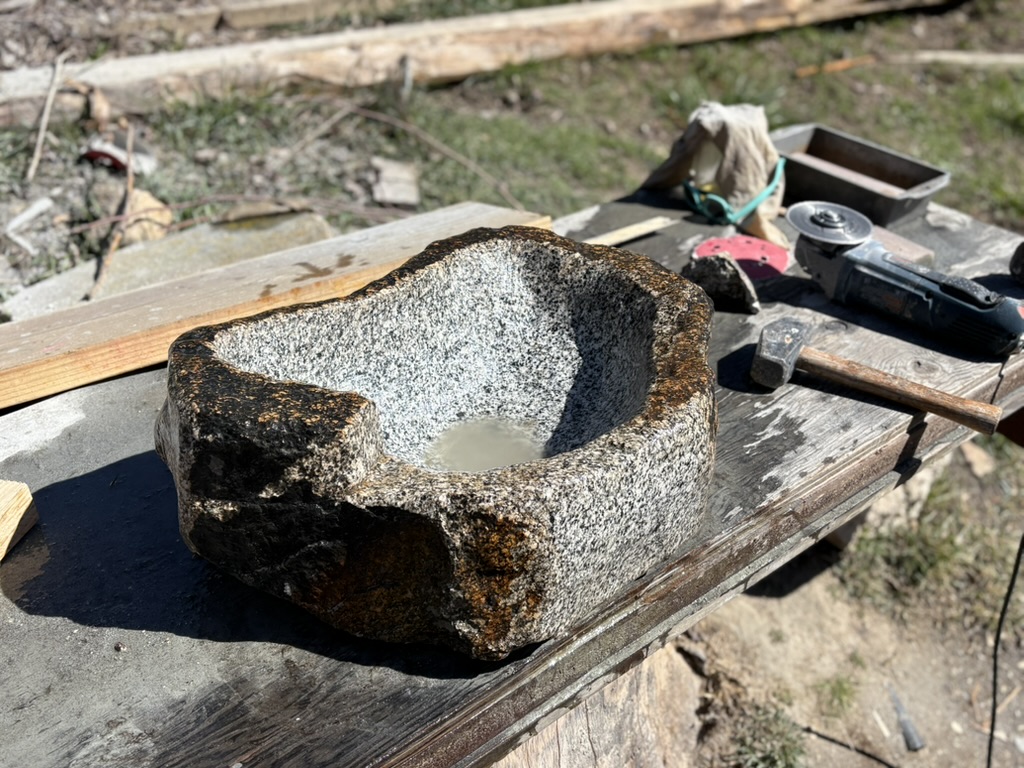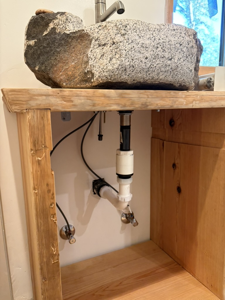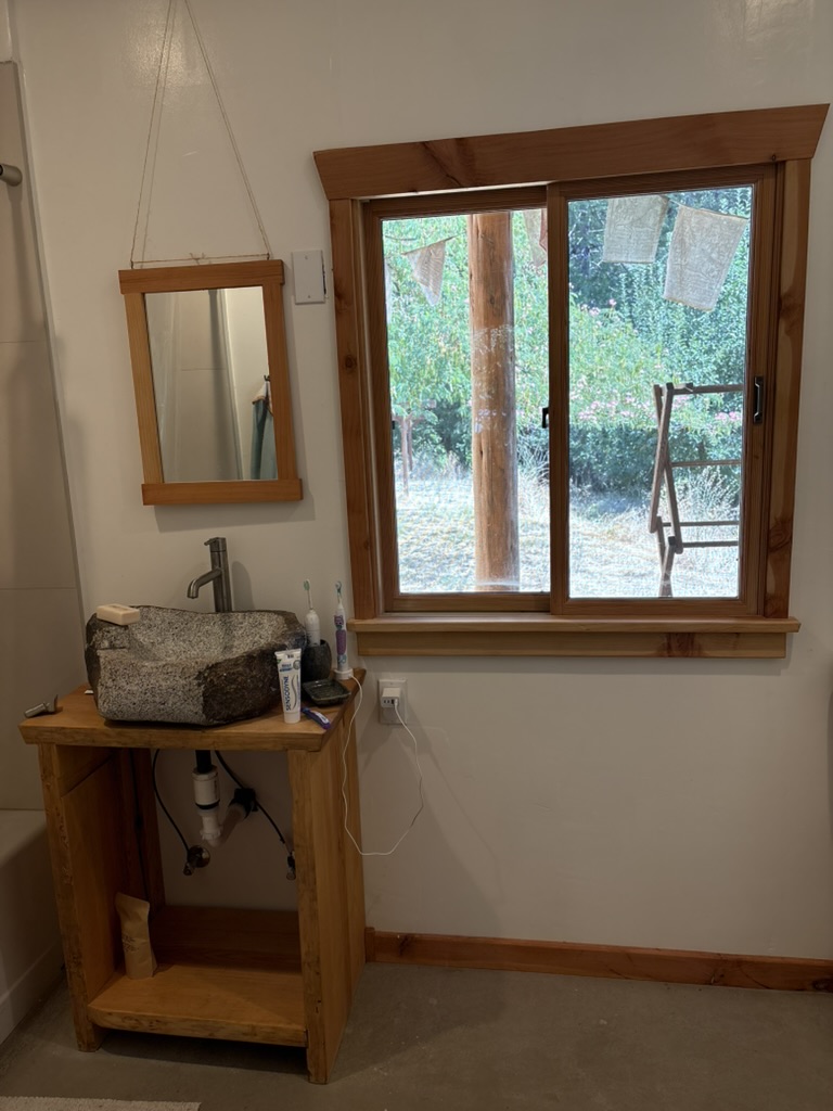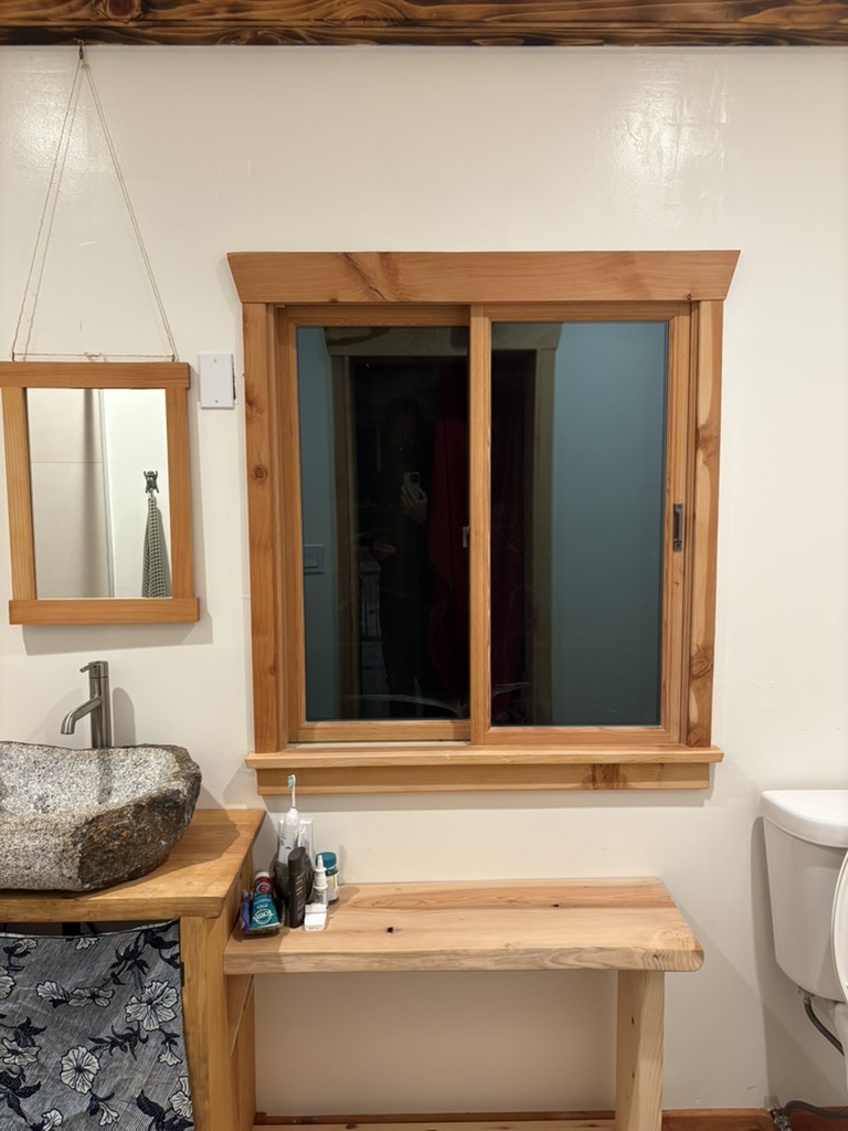 Bathroom vanity, mirror, shelving and window trim. Designed and built a cohesive unit in a small bathroom. Also carved the sink from a granite boulder in the nearby creek.