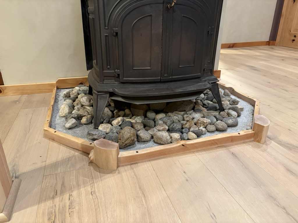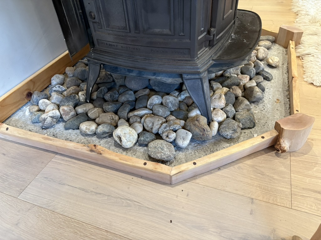 Designed, milled and built fireplace trim from locally harvested maple. Fastners hidden with black walnut plug details.