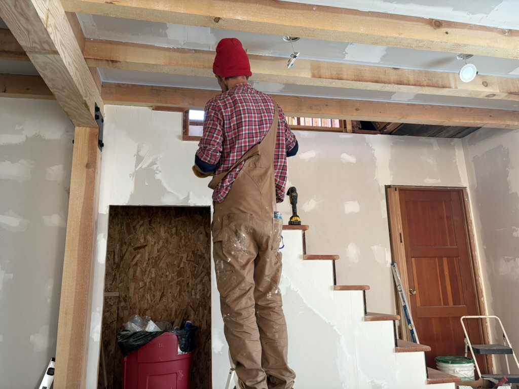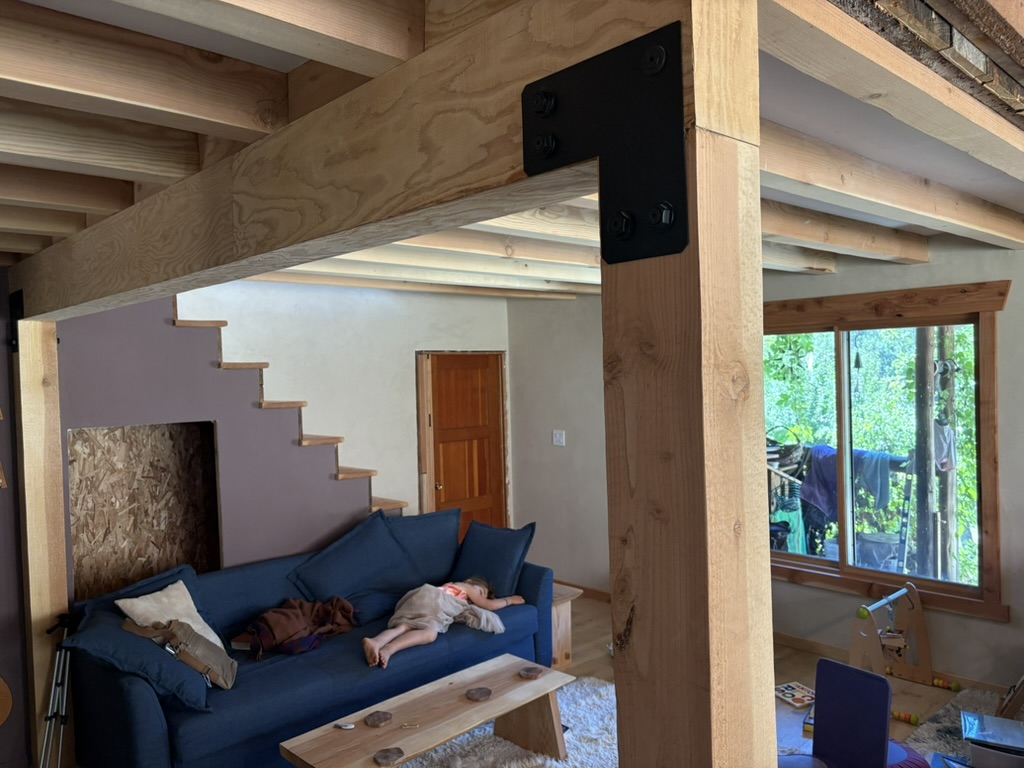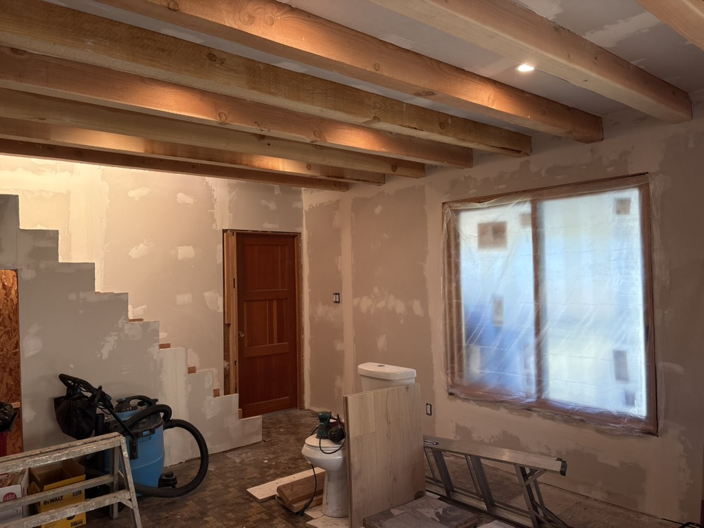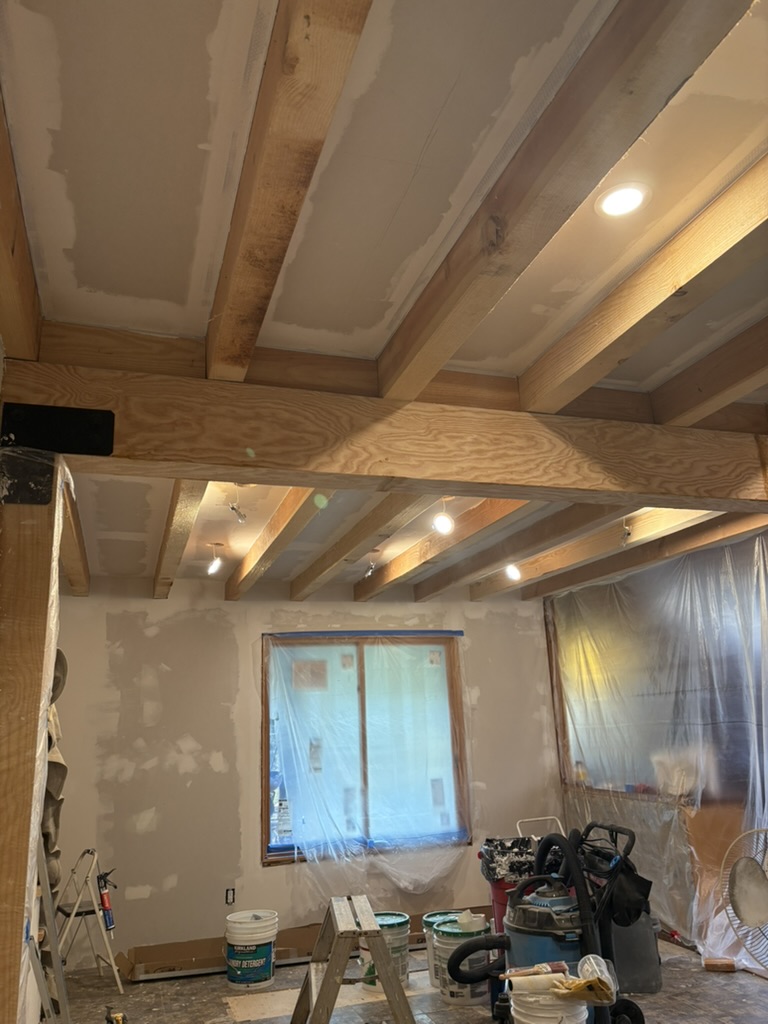 Interior timber framing: replaced falling-apart ceiling joists with new 4X8 members that spanned living room and terminated in bathroom. Designed and managed all construction.