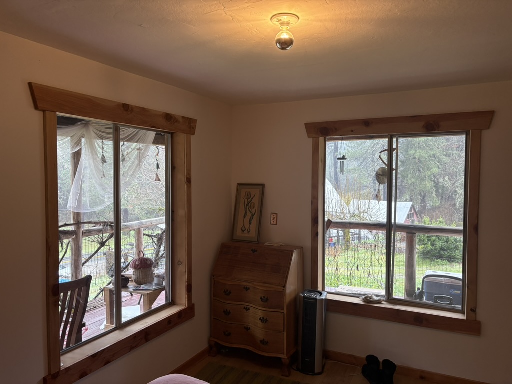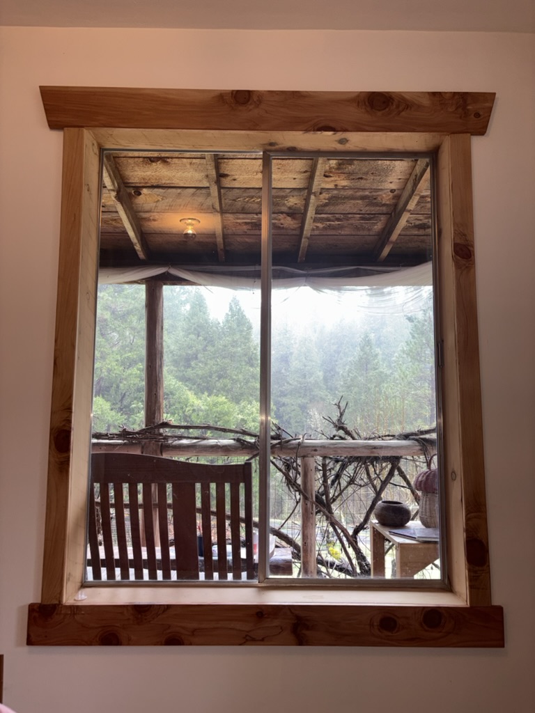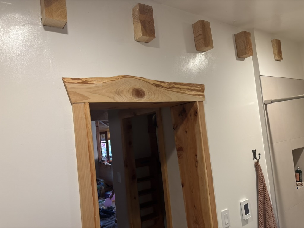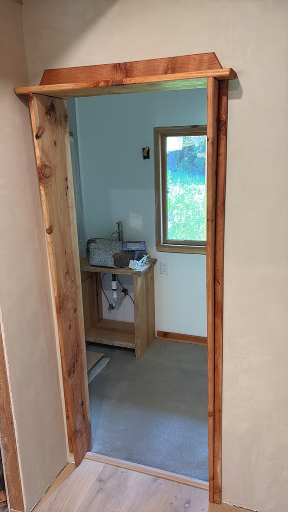 Window and door trim from locally harvested cedar. Door designed with altar shelf above.