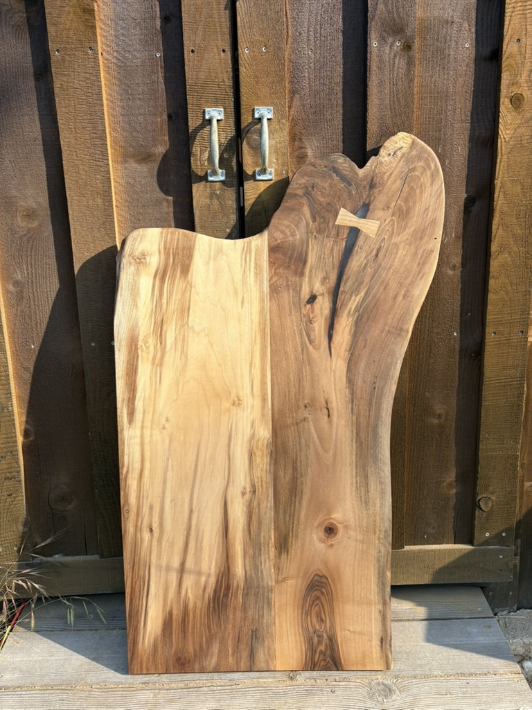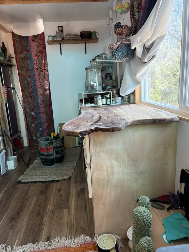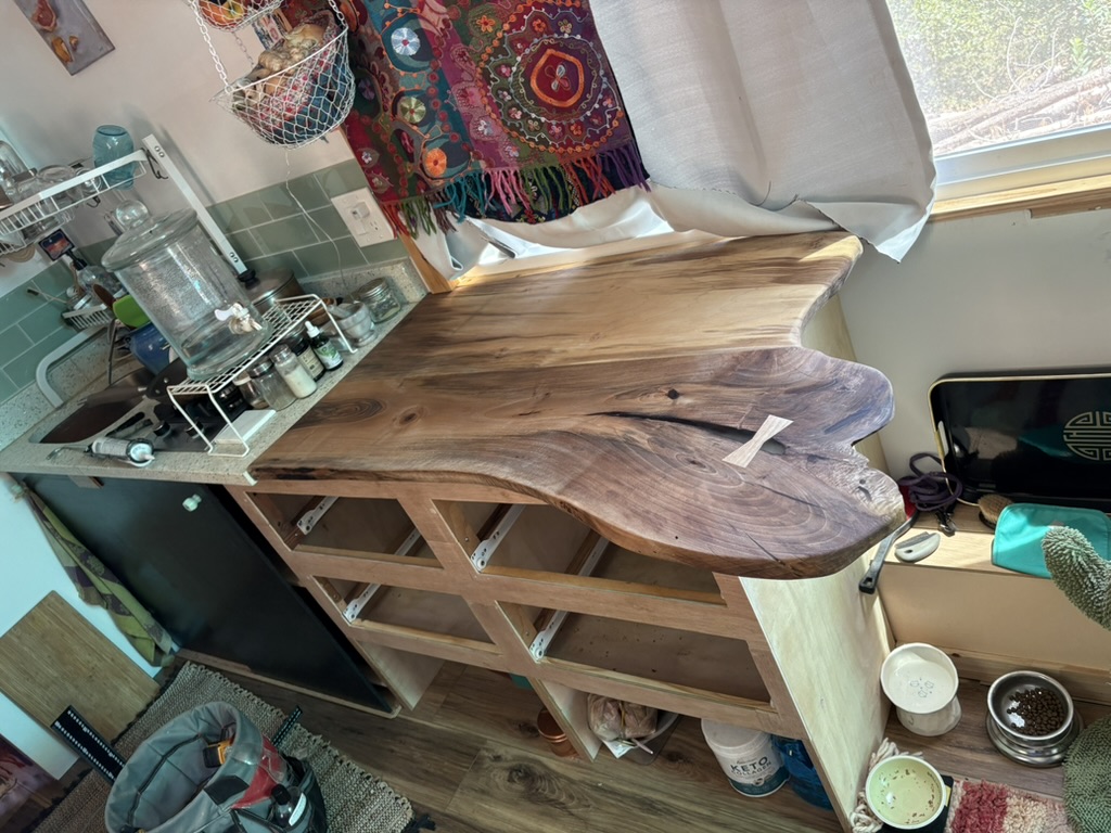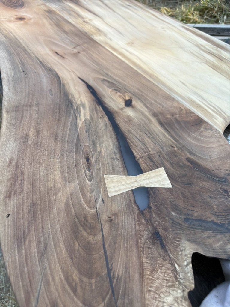 Walnut counter top. Joined two pieces of walnut and repaired splitting end with bowtie to use a treasured piece of walnut for client’s tiny home kitchen counter.