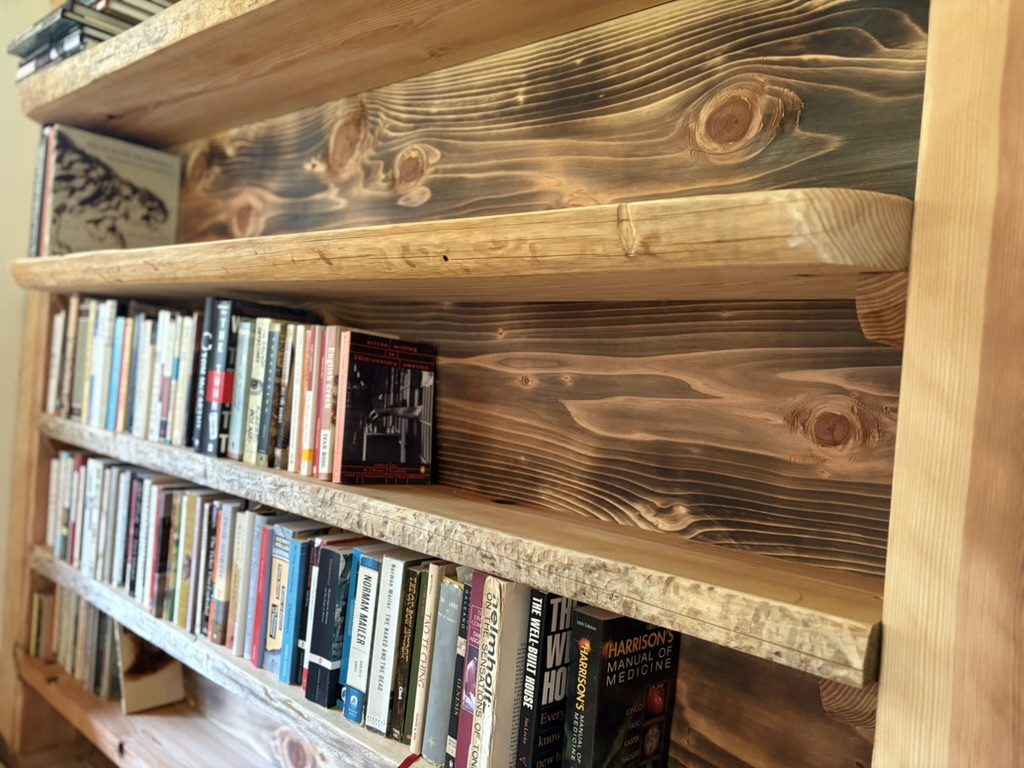 Built-in live edge shelving with burnt cedar backing